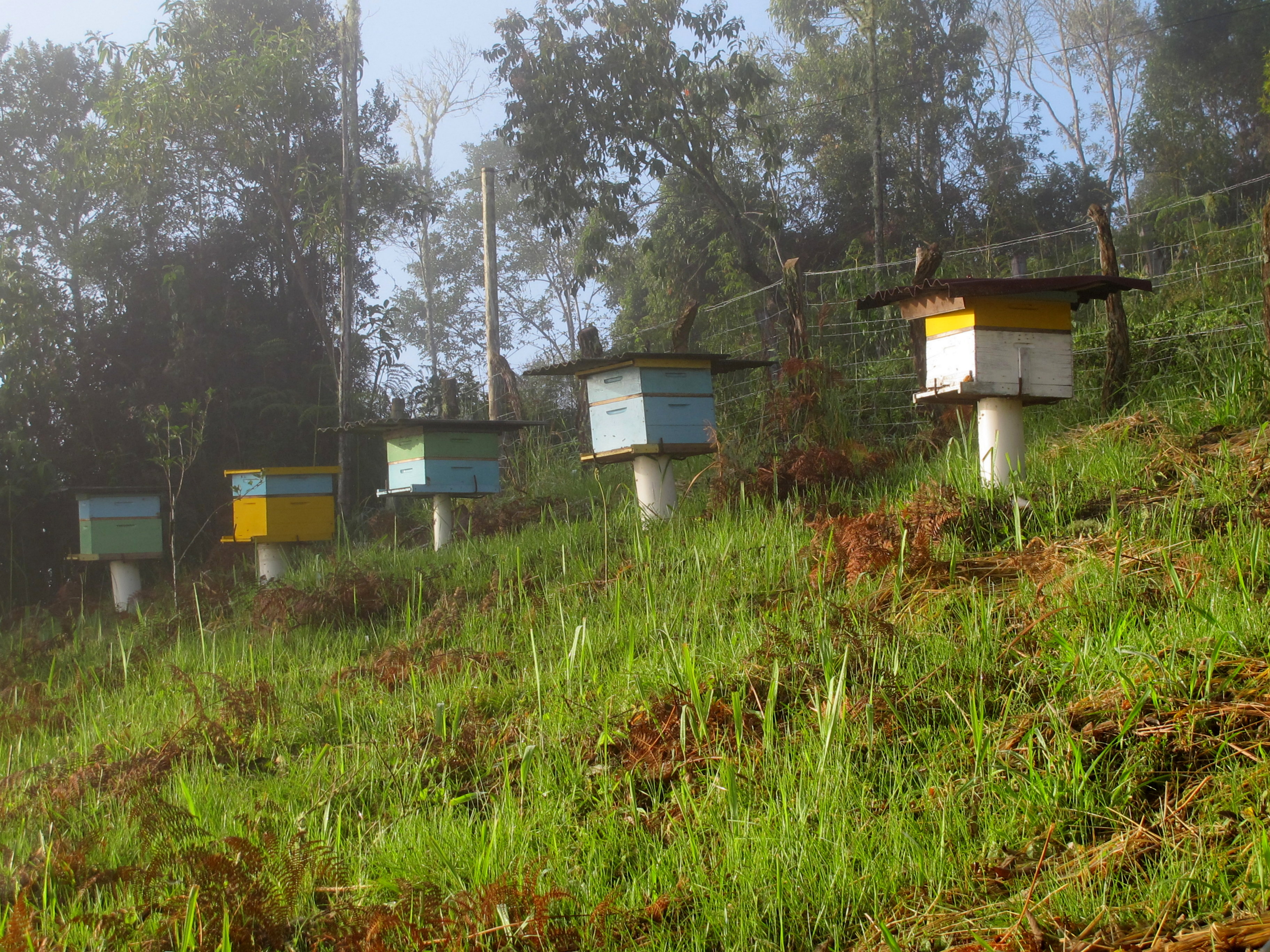 Produzimos mel em parceria com um vizinho que vem tratando das colméias. Nosso mel é de altíssima qualidade e provém de floradas silvestres da região. Dependendo da florada específica que originou o mel, ele adquire características um pouco diferentes como uma cor um pouco mais clara ou mais escura.