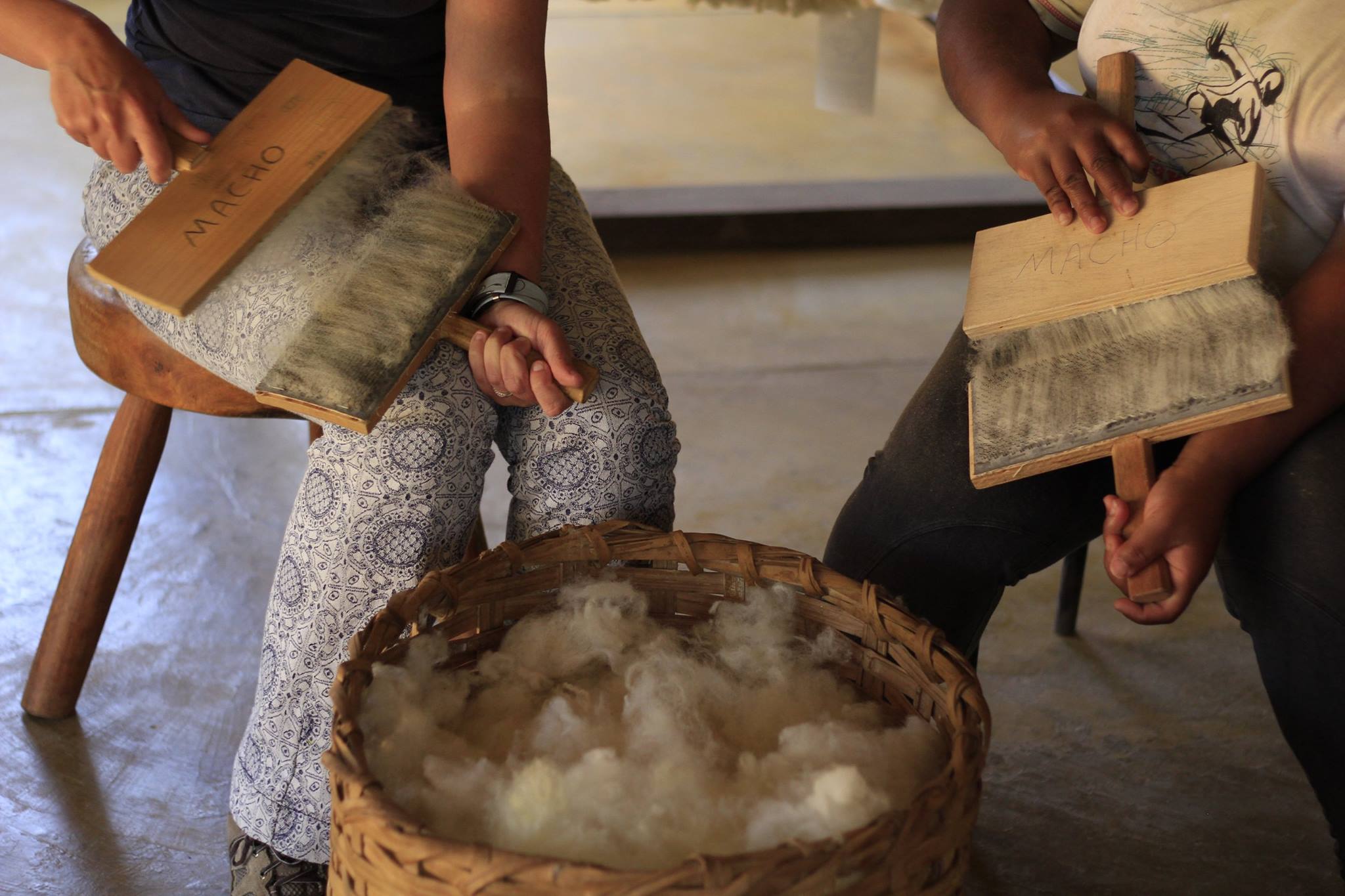 After separation, the wool is carded. Carding is a process which forms small rolls of wool which will then be spun to make the yarn.